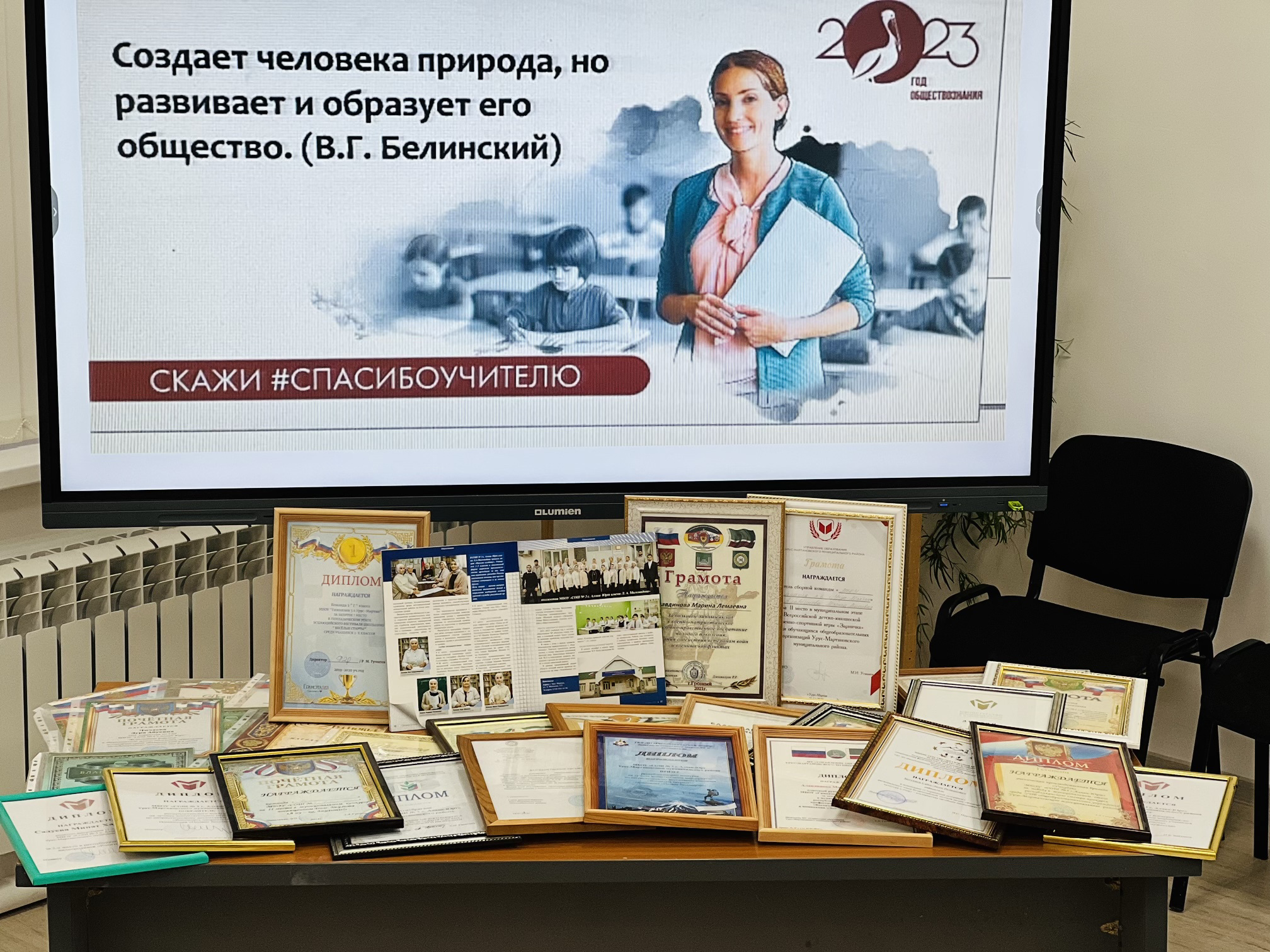 28 го октября 2023 года в рамках акции реализации мероприятий плана проведения «Года педагога и наставника» в МБОУ «СОШ №3 с. Алхан-Юрт» провели выставку "Весь этот мир творит учитель"
