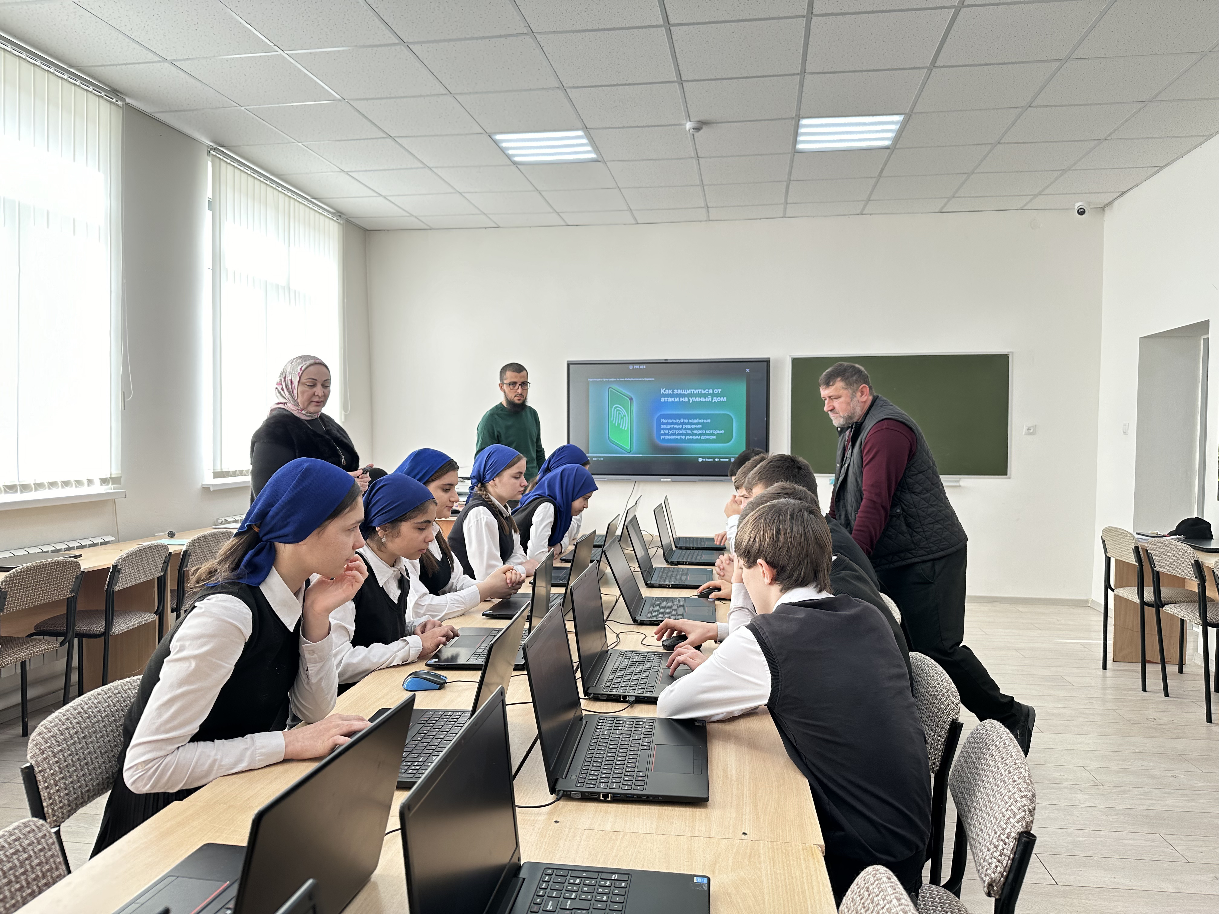 На уроке присутствовали: Инаркаев Сайд-Эмин Магомедович (заместитель главы администрации Алхан-Юртовского сельского поселения), Алавдинова Марина Лемаевна (директор школы), Арсанов Ибрагим Шааманович (заместитель директора по информатизации).