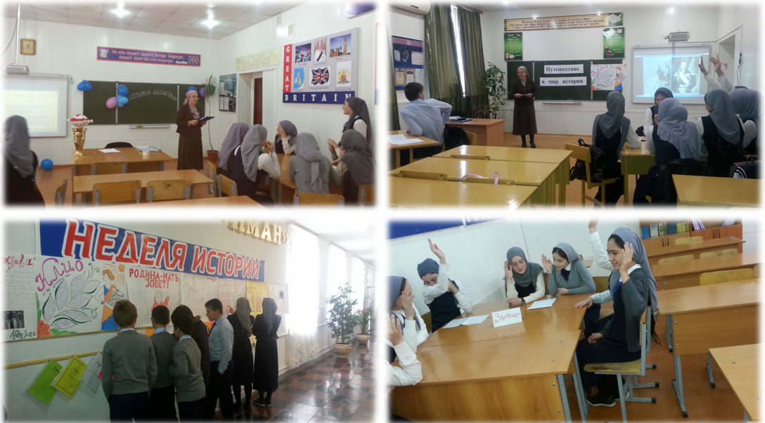 В ходе проведения недели истории проведено несколько мероприятий: викторина «Историк-бизнесмен» среди учащихся 9-х классов, ответственная учитель истории и обществознания З.С.Батаева; викторина «Путешествие в мир истории» среди учащихся 11 класса, ответственная учитель истории и обществознания З.С.Батаева; Проведены также открытые уроки учителем истории и обществознания З.С.Батаевой.